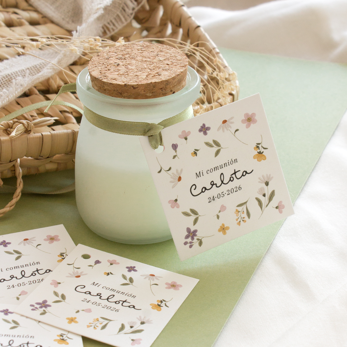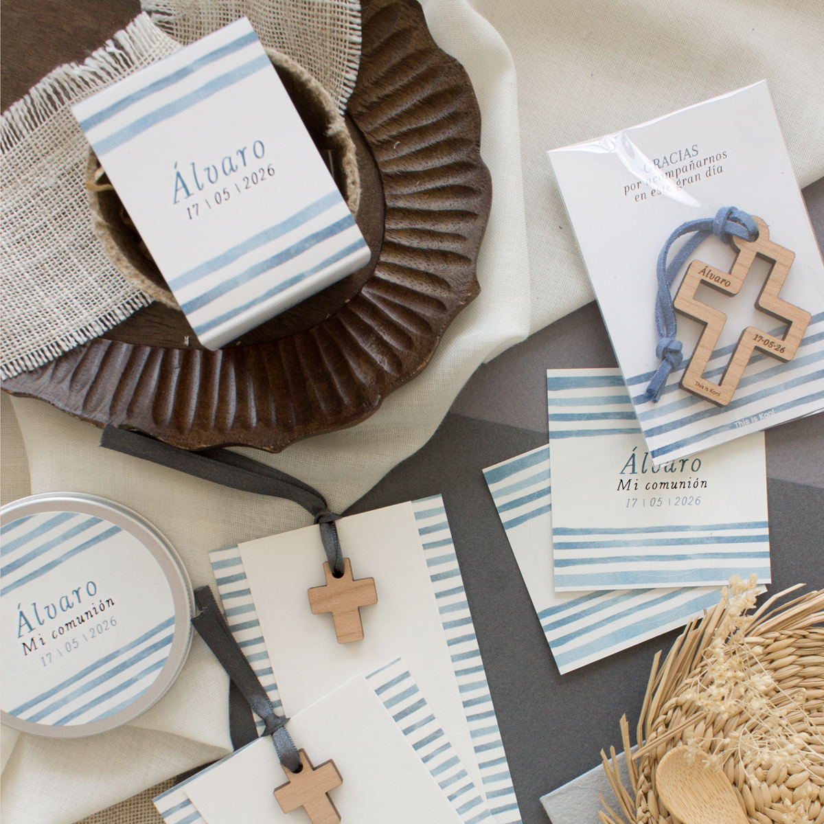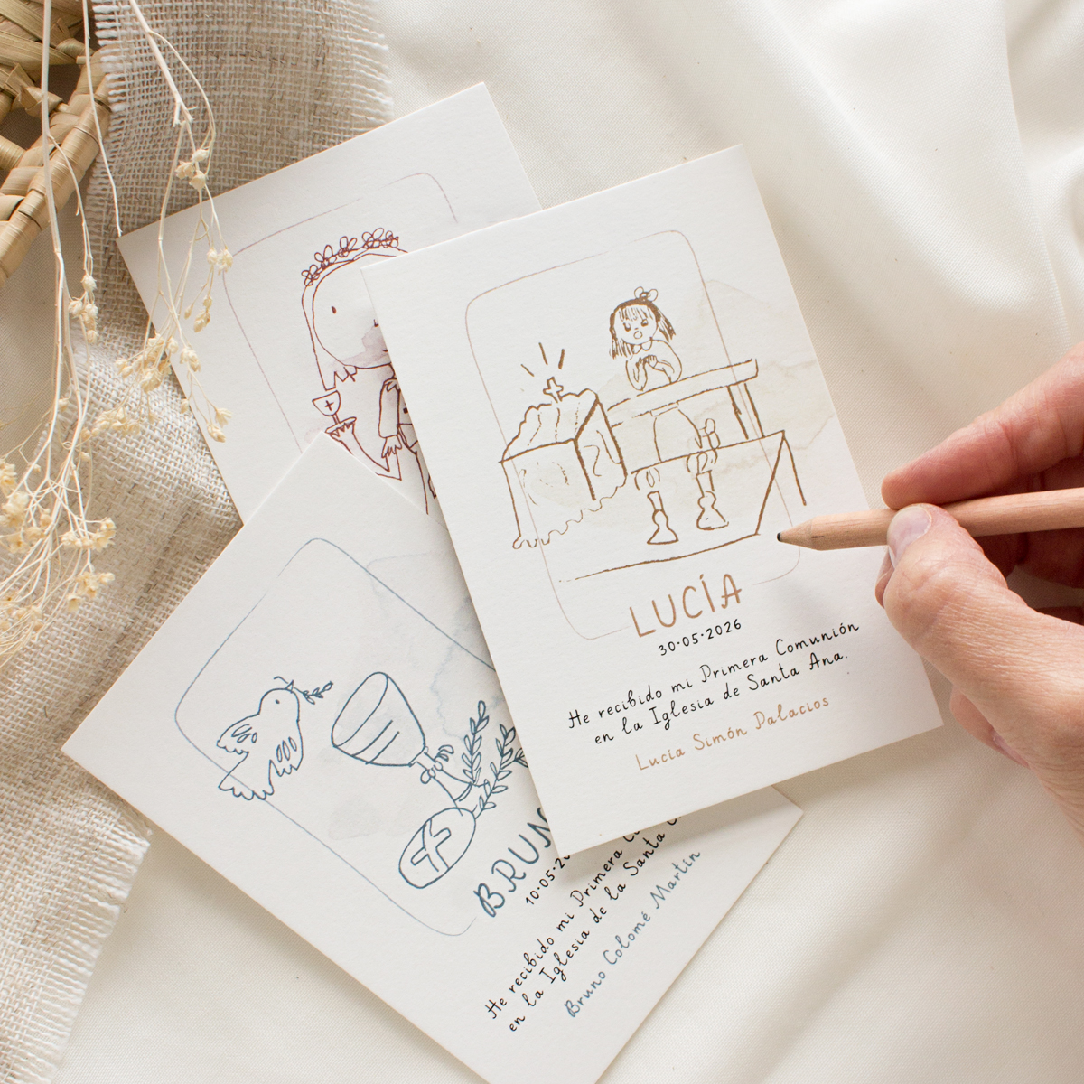 Todas incluyen invitaciones de Primera Comunión, recordatorios personalizados, marcapáginas, adhesivos, etiquetas, llaveros de madera y otros detalles para invitados, siguiendo las tendencias actuales: diseño suave, elementos naturales, acuarelas, estética floral, estilo marinero, minimalismo elegante y personalización total.