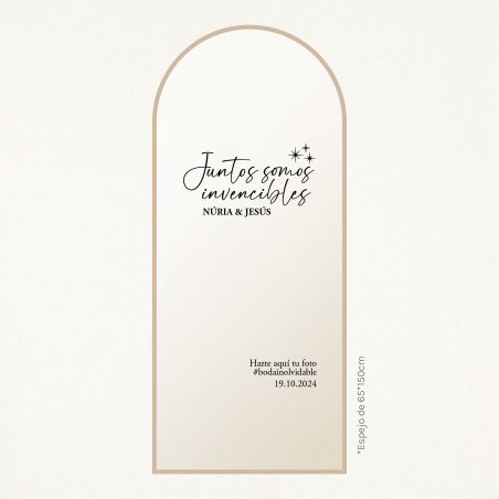 Vinil adhesiu personalitzat, amb la frase "Junts som invencibles" per posar a un mirall, que podràs col·locar a qualsevol racó el dia del casament a mode de photocall o cartell de benvinguda.