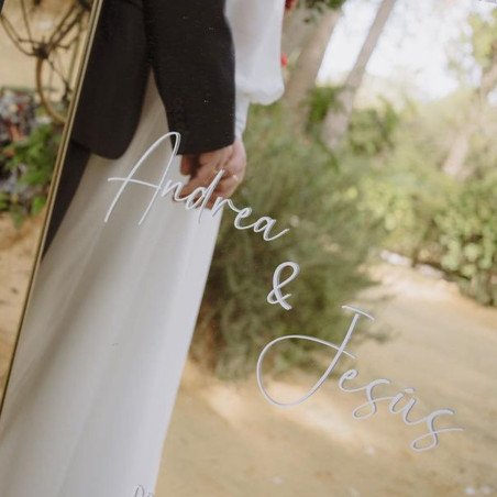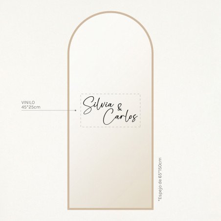 Vinil adhesiu amb els vostres noms per poder col·locar en un mirall o vidre i aconseguir un cartell o racó únic al teu casament.