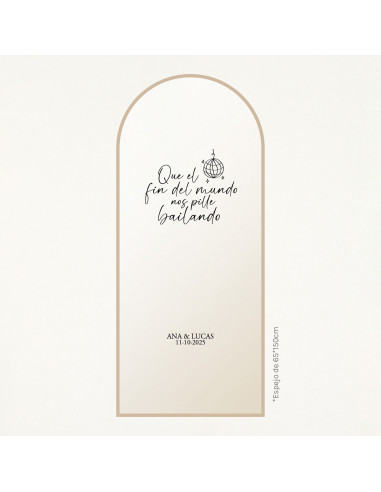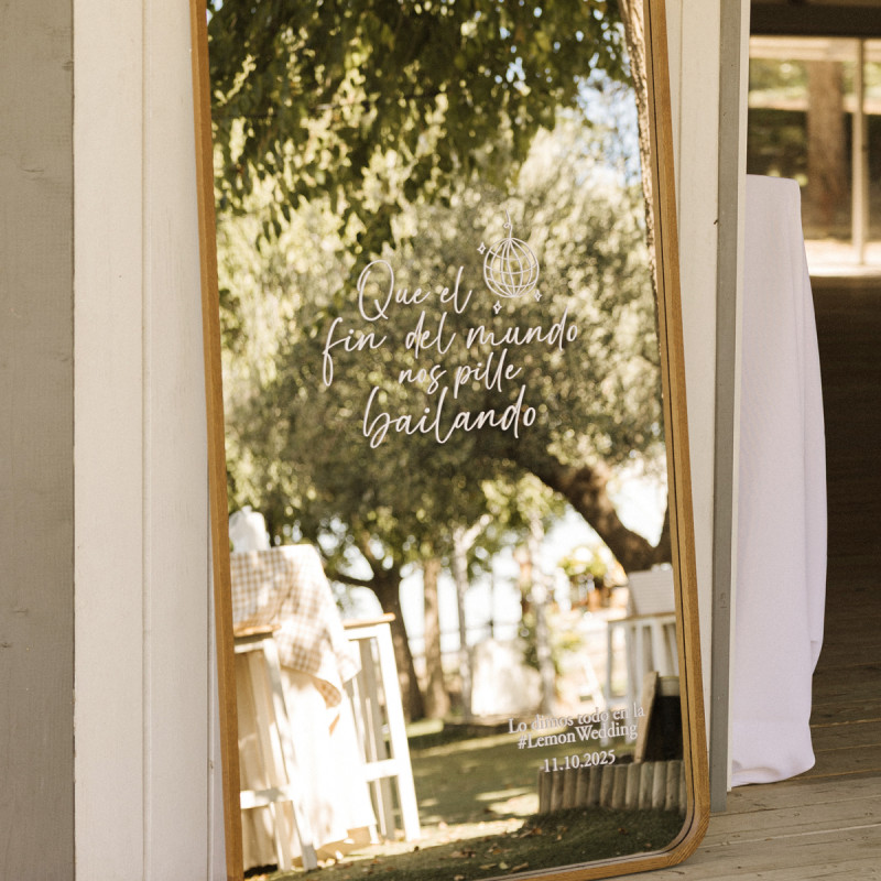 Vinil adhesiu personalitzat, amb la frase "Que la fi del món ens enxampi ballant" per posar a un mirall, que podràs col·locar a qualsevol racó el dia del casament a mode de photocall o cartell de benvinguda.