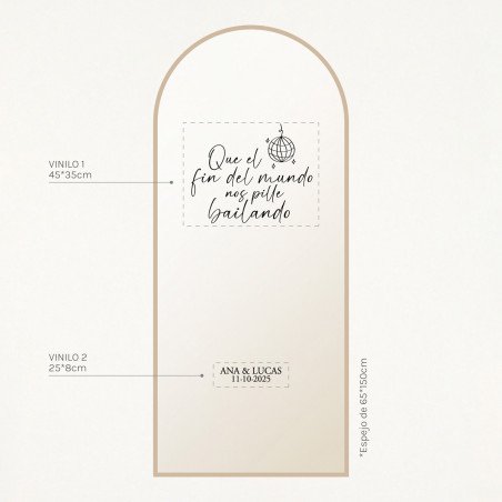 Vinil adhesiu personalitzat, amb la frase "Que la fi del món ens enxampi ballant" per posar a un mirall, que podràs col·locar a qualsevol racó el dia del casament a mode de photocall o cartell de benvinguda.