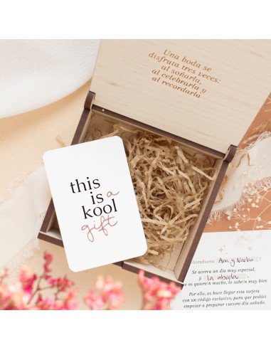 Rebràs una capseta de fusta personalitzada i, a dins, una targeta regal amb un codi exclusiu que el destinatari podrà utilitzar a tota la nostra botiga: invitacions, detalls, papereria, decoració... el que sigui!