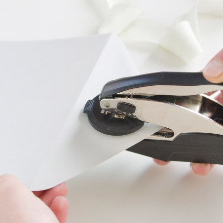 - Per a la seva utilització, introduir el paper entre les pinces i exercir pressió amb la palanca fins que quedi marcat en el paper. En papers de gramatge superior a 200 gr. el resultat pot ser menys definit.