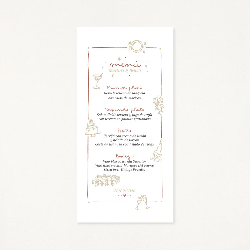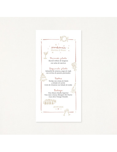 Minuta de casament personalitzada amb els vostres noms i la data. Un detall que marcarà la diferència. Tots tindran un record del gran banquet i si les col·loques damunt dels plats donaran el toc final a la decoració de la taula.