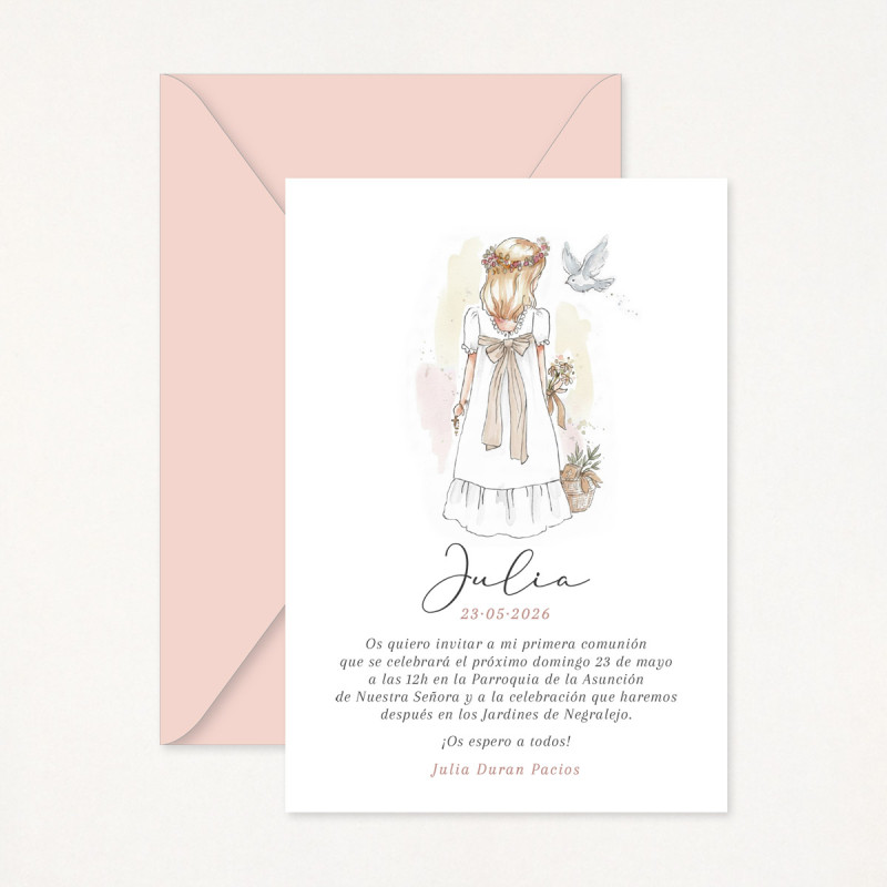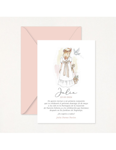 Un disseny amb una il·lustració en aquarel·la de la nena, que podràs acabar de personalitzar escollint el color dels cabells: ros, castany o bru.