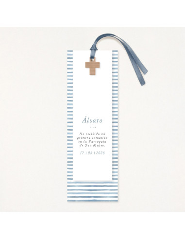 Un disseny premium, amb un estampat mariner amb ratlles blaves en aquarel·la i una creu de fusta units per una cinta de ras.
