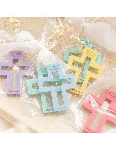 Un imant amb forma de creu i personalitzat amb el nom del/la protagonista i la data de l'esdeveninment.