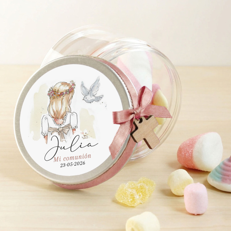 Pot transparent amb tapa d'alumini personalitzat amb el seu nom i la data de la primera comunió.
