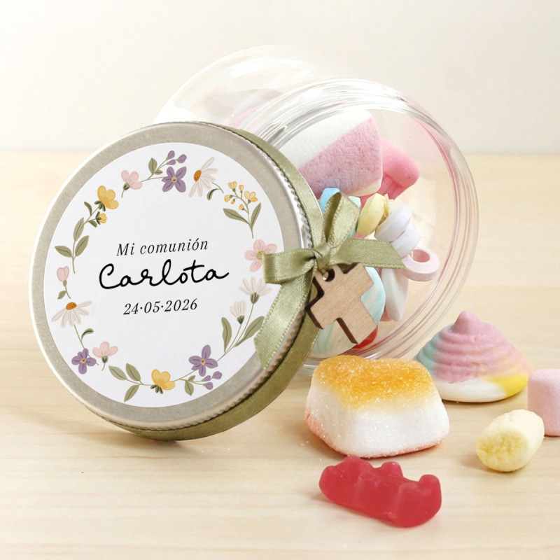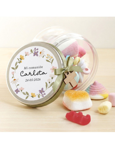 Pot transparent amb tapa d'alumini personalitzat amb el seu nom i la data de la primera comunió.