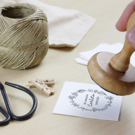 Segell de goma amb muntura de fusta. Adaptarem el disseny del segell a la muntura que més s'ajusti (Rodó: Ø40mm aprox. | Quadrado: 40x40mm aprox. | Rectangular: 50x30mm aprox.).