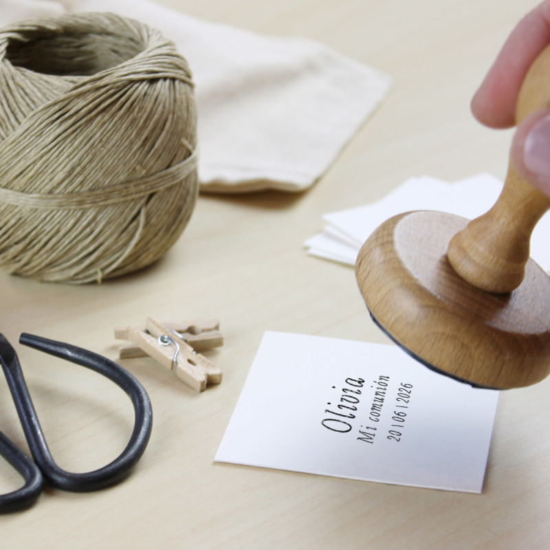 - Segell de goma amb muntura de fusta. Adaptarem el disseny del segell a la muntura que més s'ajusti (Rodó: Ø40mm aprox. | Quadrado: 40x40mm aprox. | Rectangular: 50x30mm aprox.).