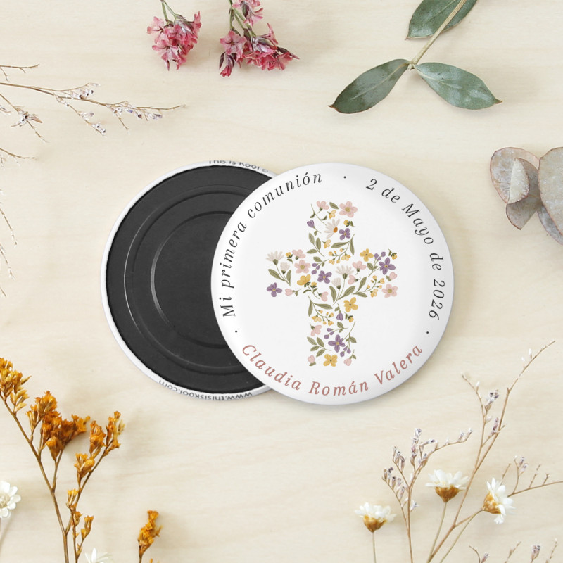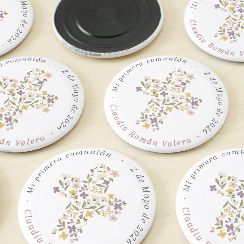 Imant rodó de 56mm de diàmetre personalitzat amb el nom i la data de la seva Primera Comunió.