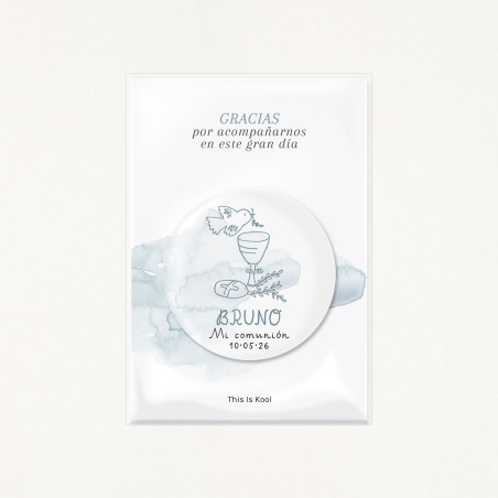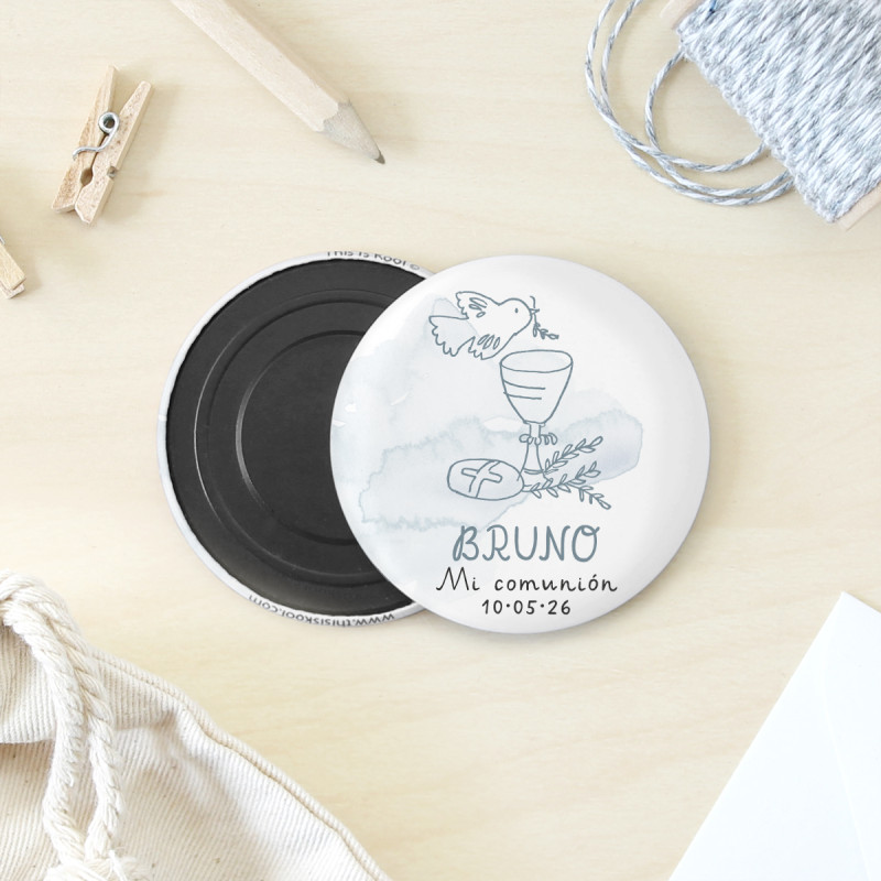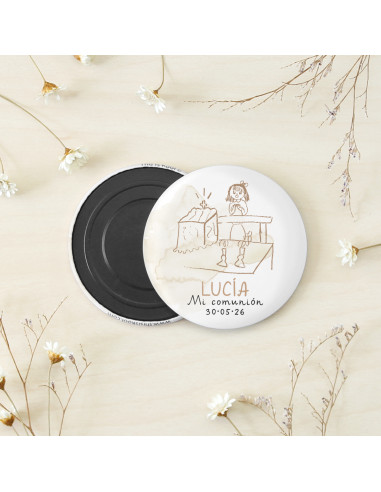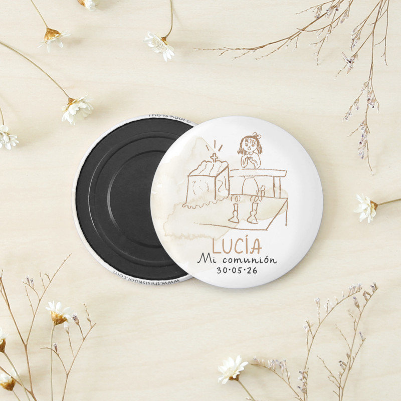 Imant rodó de 56mm de diàmetre personalitzat amb el nom i la data de la seva Primera Comunió.