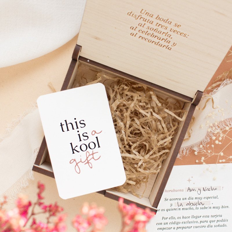 Rebràs una capseta de fusta personalitzada i, a dins, una targeta regal amb un codi exclusiu que el destinatari podrà utilitzar a tota la nostra botiga: invitacions, detalls, papereria, decoració... el que sigui!
