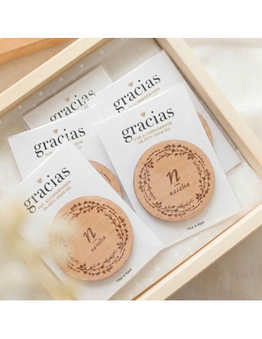 Imant de fusta natural gravat amb el nom i la data de la seva Primera Comunió.