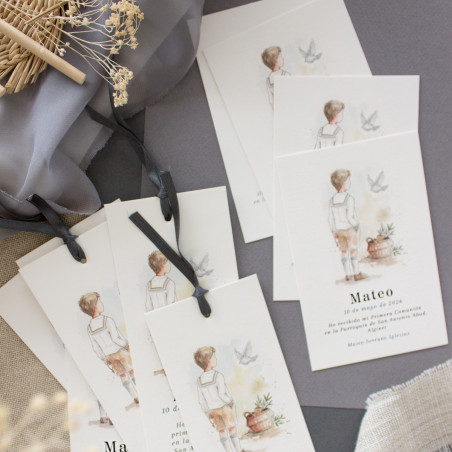 Un disseny amb una il·lustració en aquarel·la del nen, que podràs acabar de personalitzar escollint el color dels cabells: ros, castany o bru.