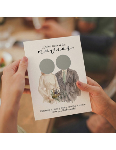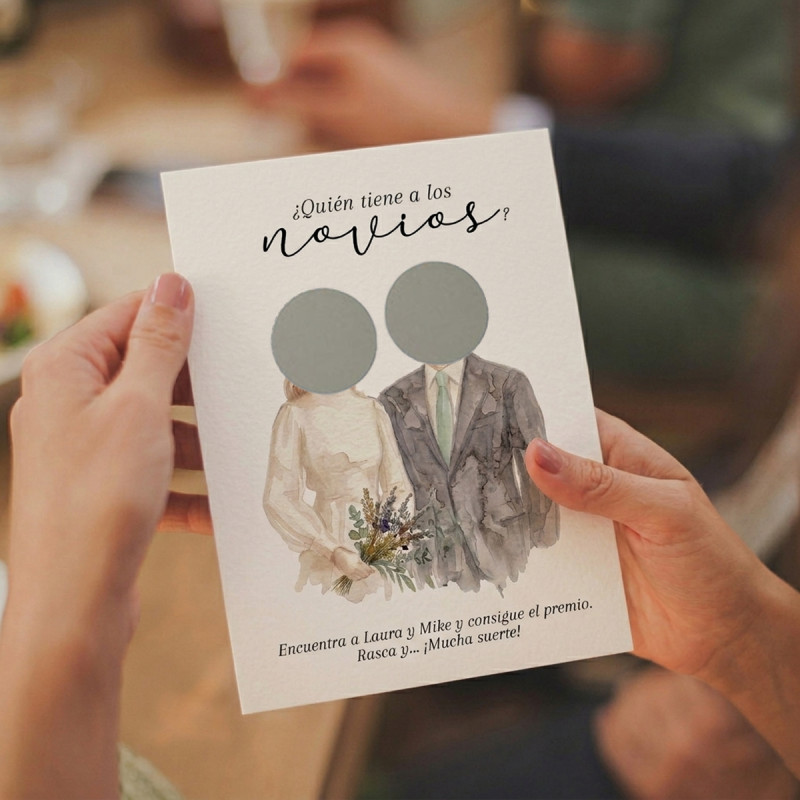 Cada tarjeta tendrá dos imágenes aleatorias ocultas bajo una capa de rasca. Solo algunas contienen la foto de los novios… ¿quienes serán los afortunados en encontrarlas?