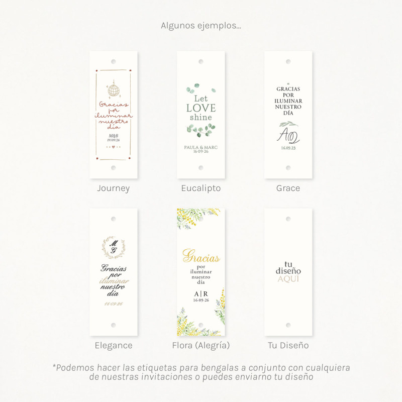 - Etiqueta de 12x4,5cm con agujeros para pasar la bengala, impresa en papel blanco natural de 240gr.