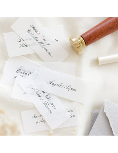 Tarjeta personalizada con el nombre y apellido de cada invitado o familia para que puedas colocar en sobres de invitaciones, menús,... y darle ese toque tan especial y único.