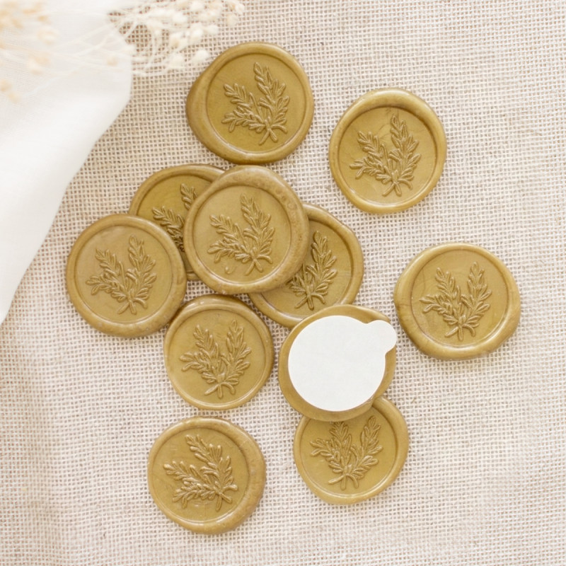 Hechos con un sello de lacre con una elegante ilustración de una hoja de romero, serán el toque perfecto para cualquier complemento de boda.
