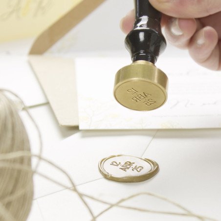 Sello para lacre de 25mm de diámetro con empuñadura de madera y base metálica.