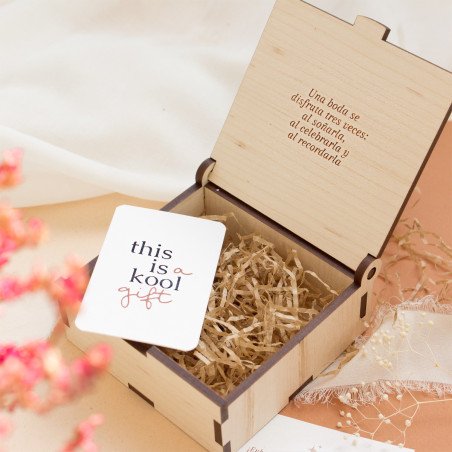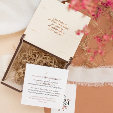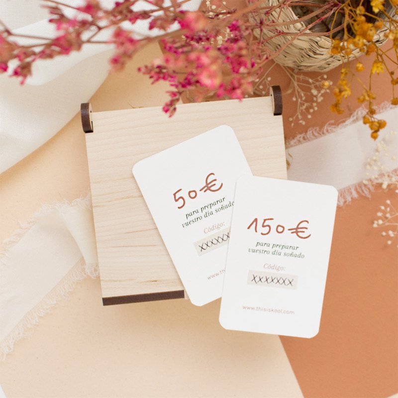 Recibiràs una cajita de madera personalizada y dentro, una tarjeta regalo con un código exclusivo que el destinatario podrá usar en toda nuestra shop: invitaciones, detalles, papelería, decoración... ¡lo que sea!