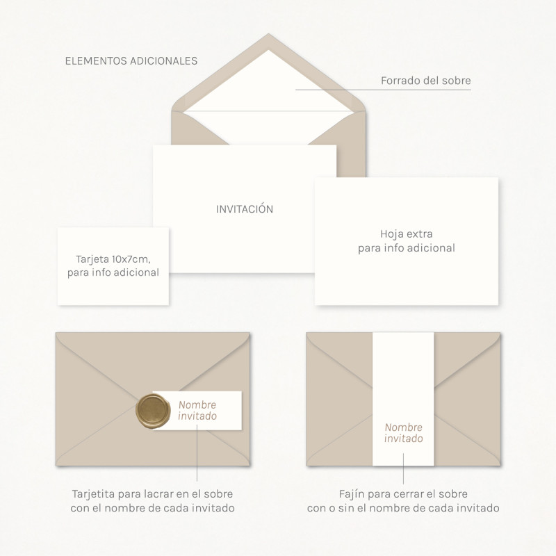 Incluye el tarjetón de la invitación y el sobre. (No incluye ilustraciones personalizadas. Consúltanos precio aquí). Las imágenes son un ejemplo de composición. Podrás acabar de configurar tu invitación con los complementos que quieras (tarjeta adicional, hoja extra con el timeline de la boda, sello,...) |