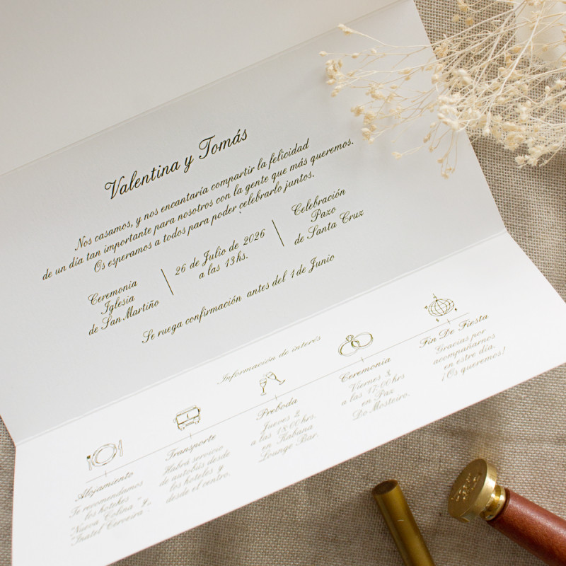 Totalmente personalizable y disponible en papeles y acabados premium, esta invitación tríptico de boda destaca por su presentación cuidada y por la sensación especial que provoca al desplegarla.