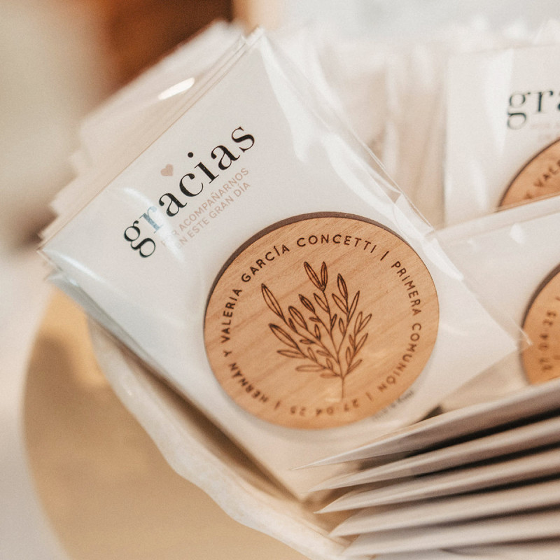 Imán de madera natural grabado con el nombre y la fecha de su Primera Comunión.