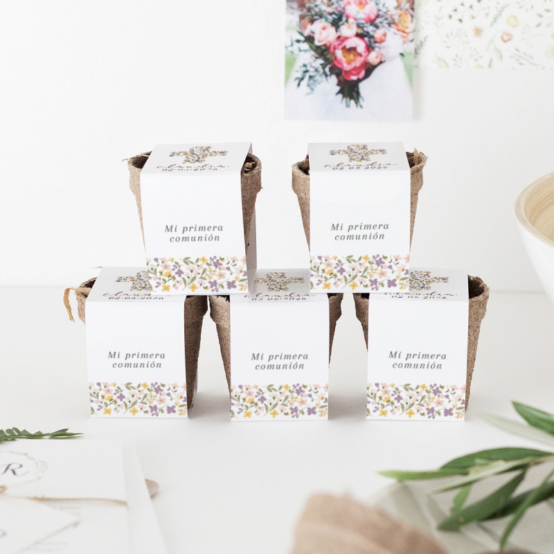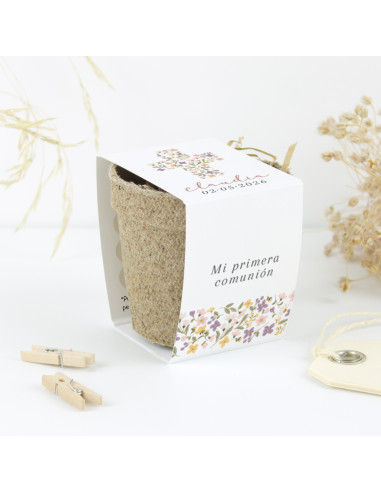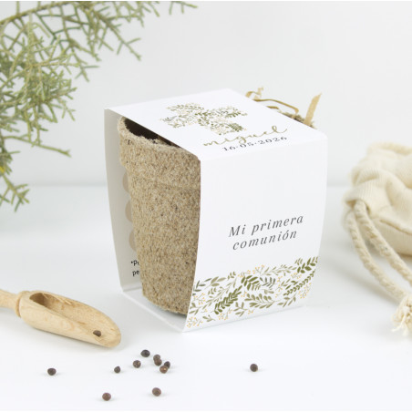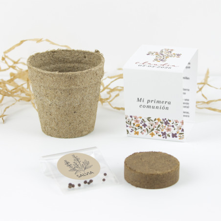 Kit de cultivo con semillas de salvia, personalizado con el nombre y la fecha de su Primera Comunión.