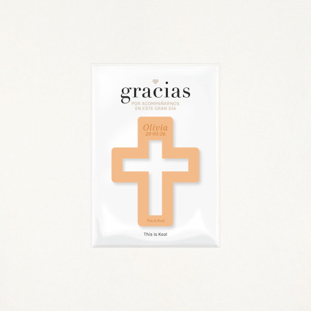 Un imán con forma de cruz y personalizado con el nombre del/la protagonista y la fecha del evento.