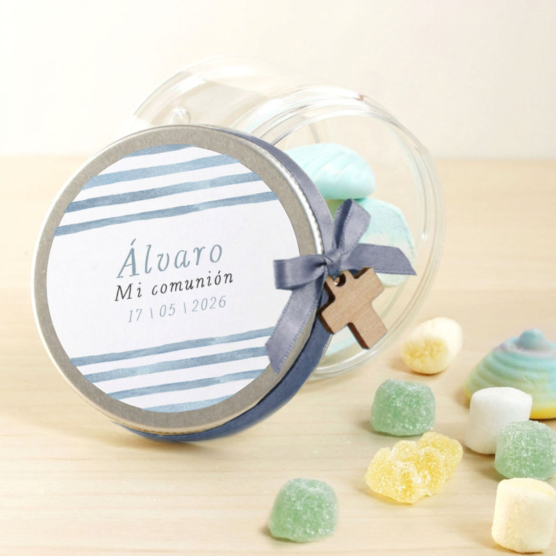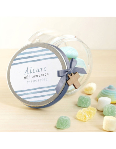 Tarro transparente con tapa de aluminio personalizado con su nombre y la fecha de la primera comunión.