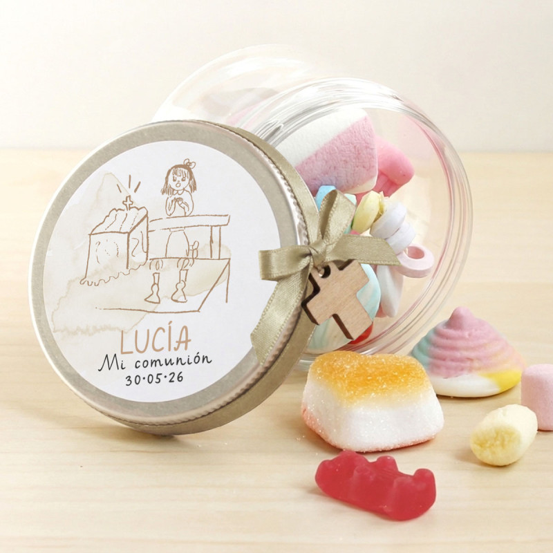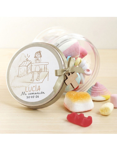 Tarro transparente con tapa de aluminio personalizado con su nombre y la fecha de la primera comunión.