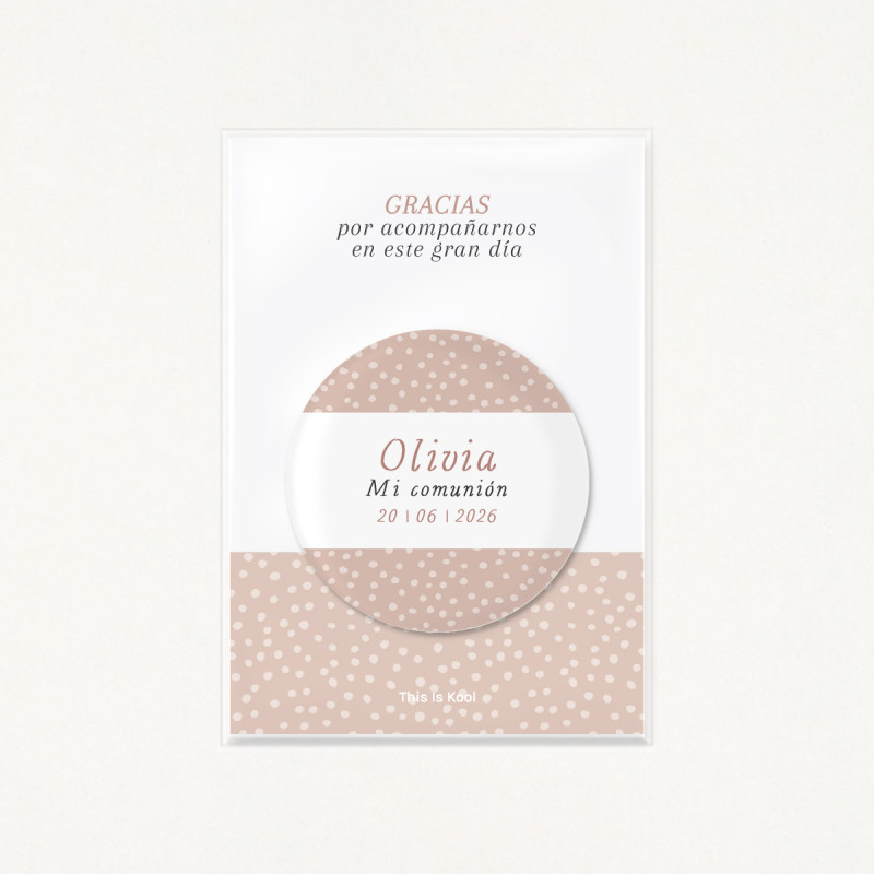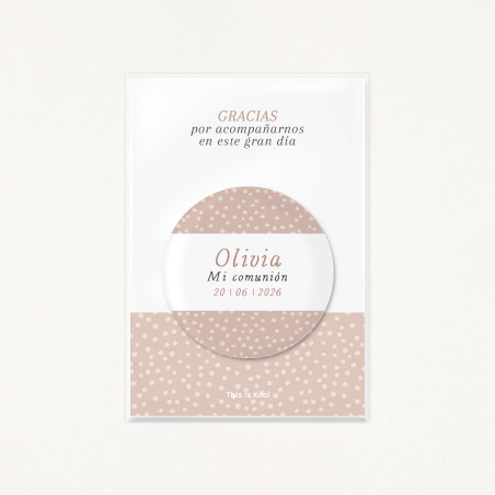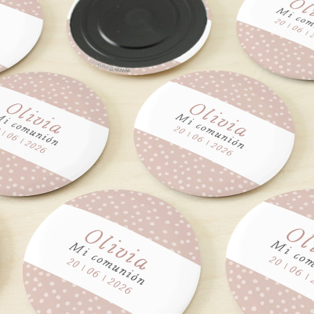 Imán redondo de 56mm de diámetro personalizado con el nombre y la fecha de su Primera Comunión.