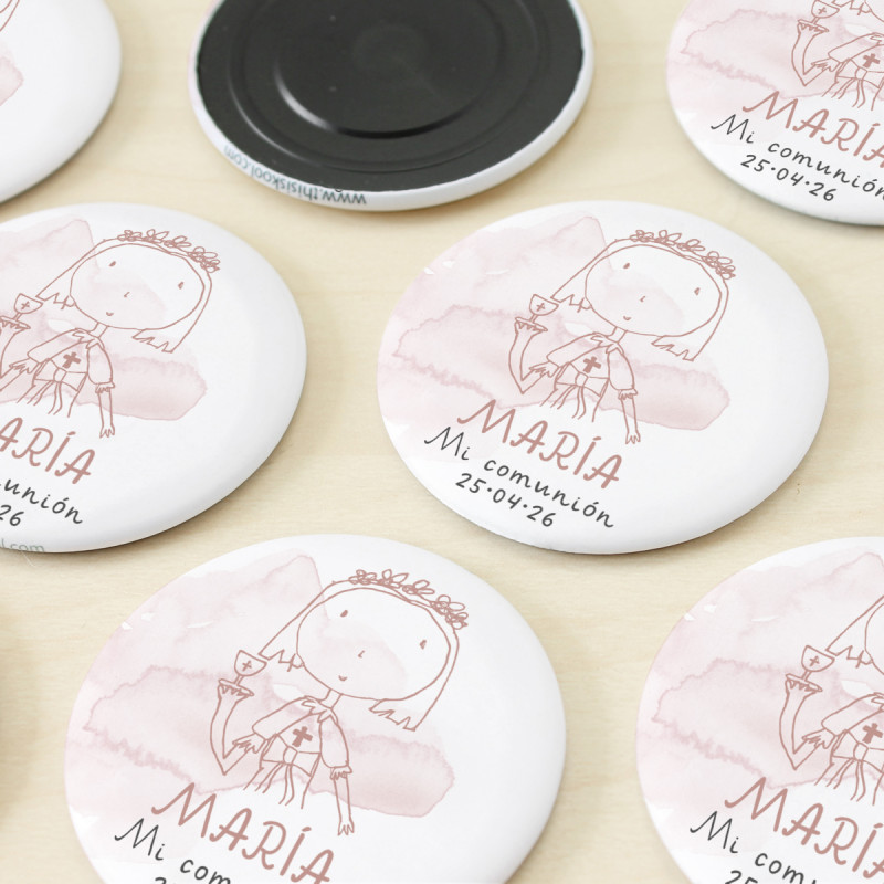 Imán redondo de 56mm de diámetro personalizado con el nombre y la fecha de su Primera Comunión.