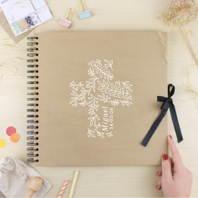 - Álbum de scrapbooking de 30x30cm con tapas rígidas, 40 hojas interiores del mismo color que la tapa, encuadernación en espiral y cierre con lazo de satén negro.