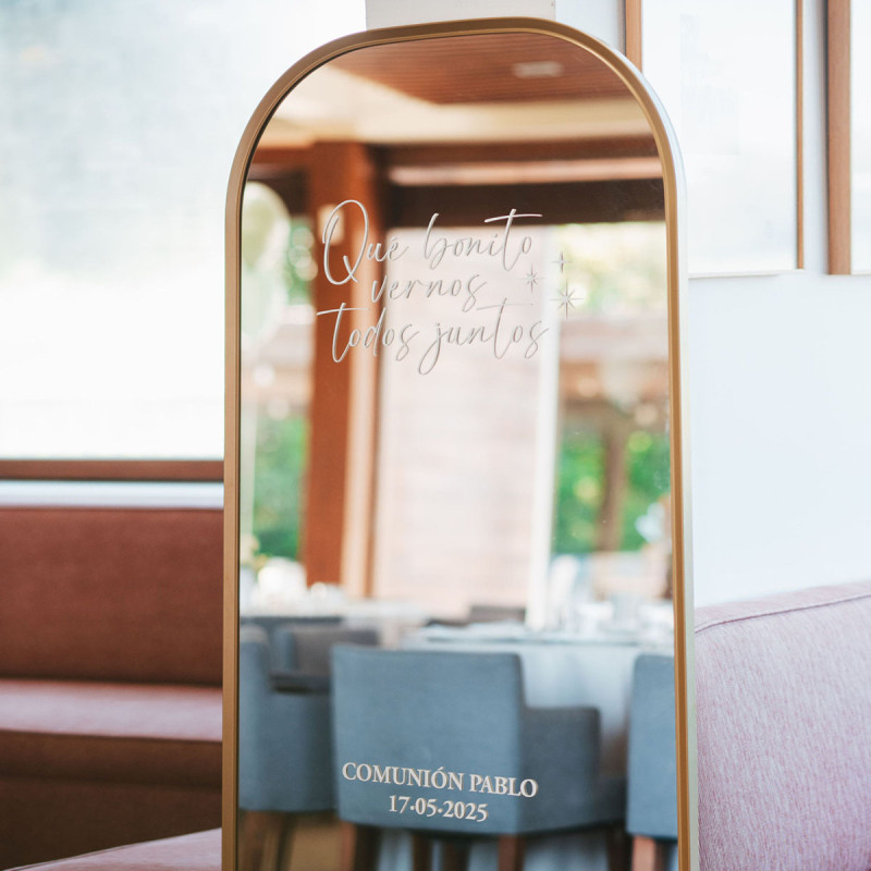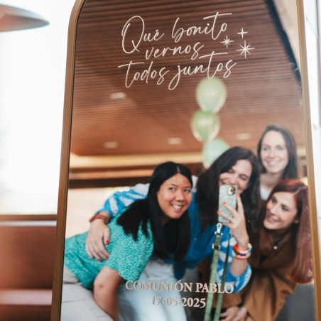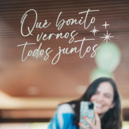 Vinilo adhesivo personalizado, con la frase "Qué bonito vernos todos juntos", para poner en un espejo que podrás colocar en cualquier rincón el día de su bautizo o primera comunión a modo de photocall o cartel de bienvenida.