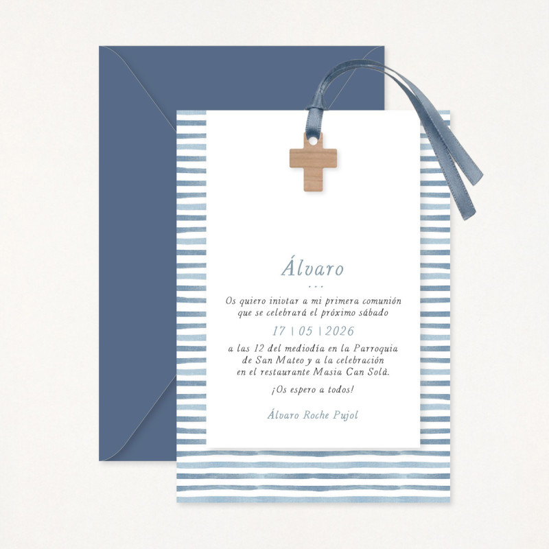Un diseño premium, con un estampado de marinero con rayas azules en acuarela y una cruz de madera unidos por una cinta de raso.