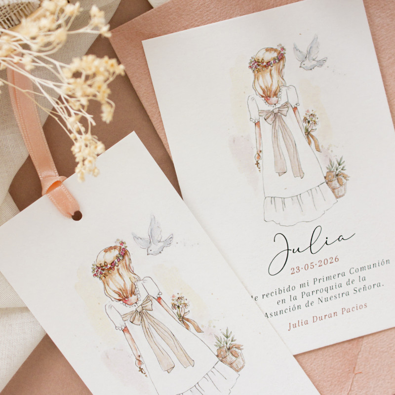 Un diseño con una ilustración en acuarela de la niña, que podrás acabar de personalizar escogiendo el color del pelo: rubio, castaño o moreno.