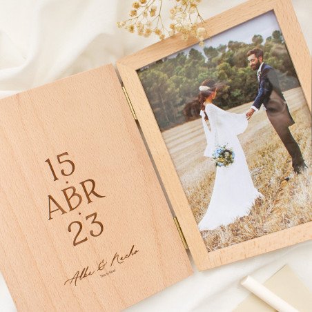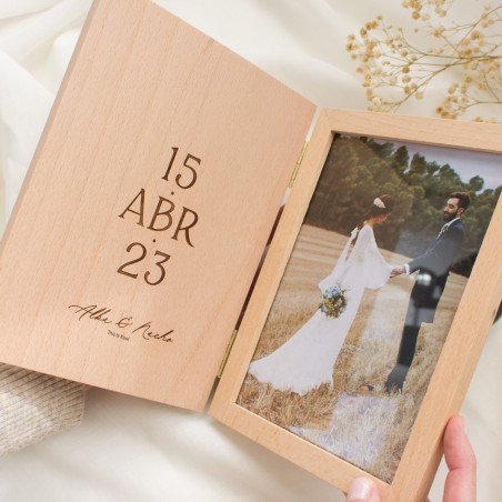 Marco de fotos de madera personalizado, de haya maciza, tipo libro, de 15*20cm (cerrado), con espacio para poner una fotografía de 13*18cm.